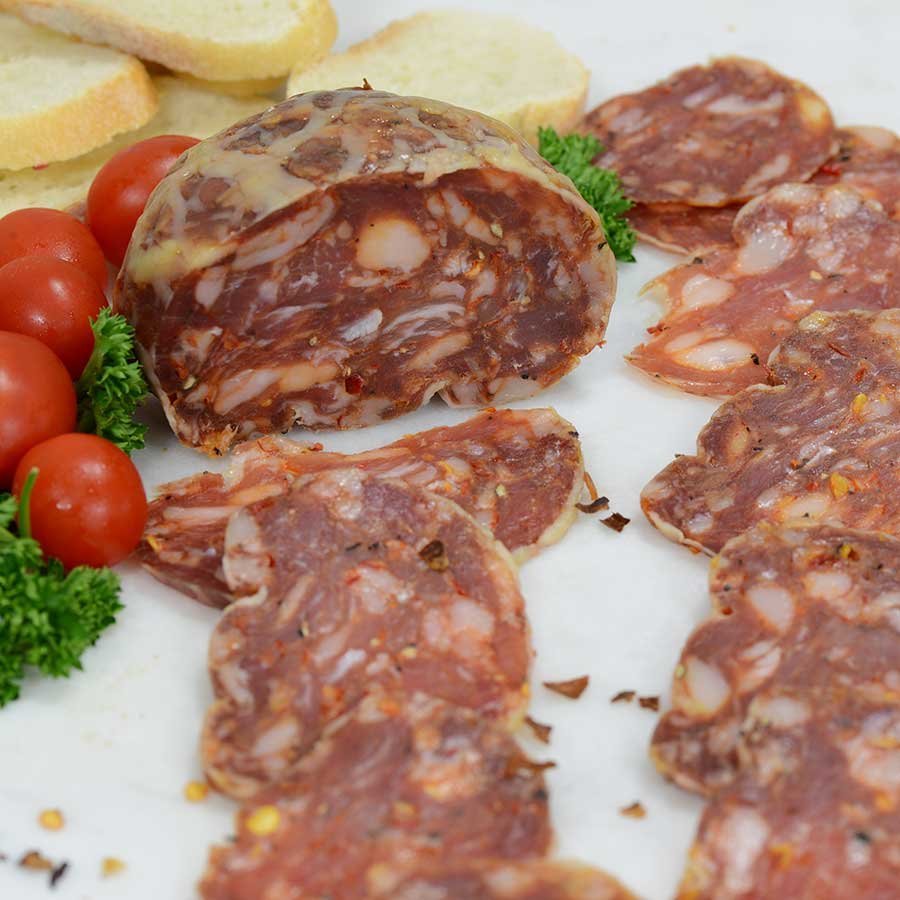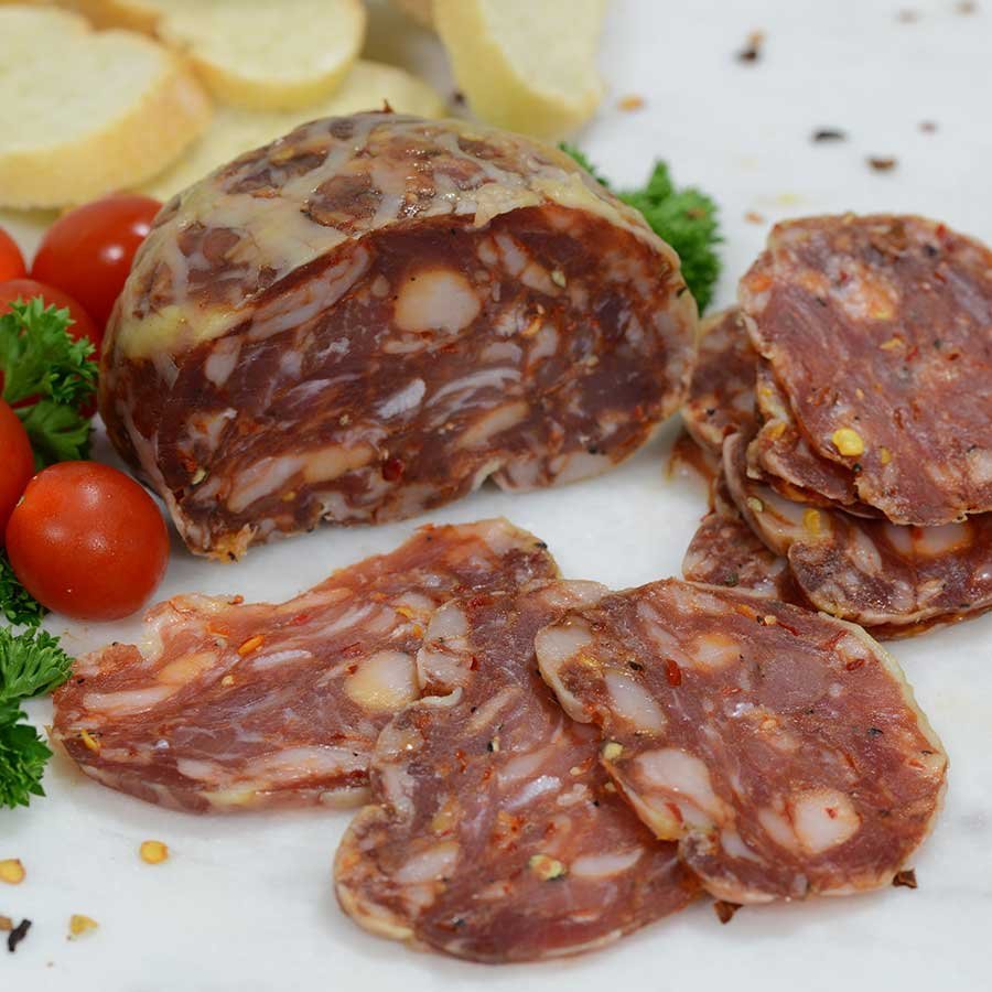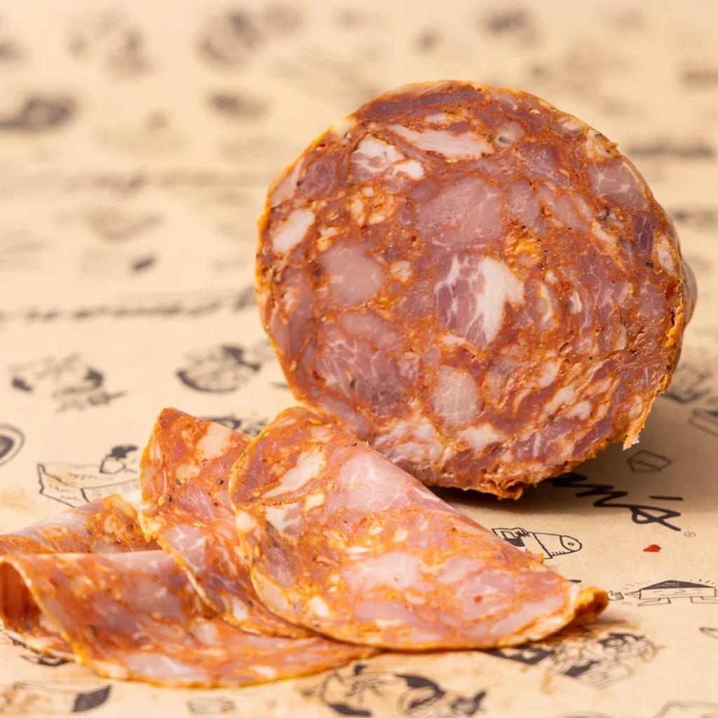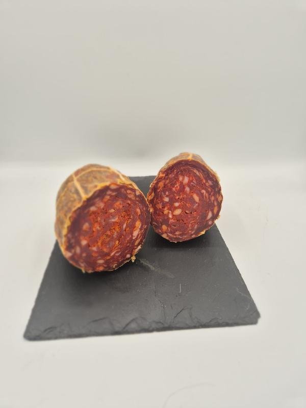 Su proceso de curación es lento y meticuloso, realizado en entornos controlados de temperatura y humedad, lo que permite que los sabores se desarrollen de forma gradual y profunda. El resultado es un embutido con una corteza fina y crujiente, y una carne jugosa, rojiza y marmoleada por la grasa ibérica, que le confiere un sabor dulce y aterciopelado, sin grasa excesiva.